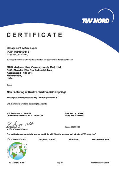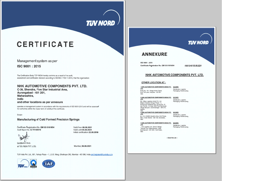 NHK Automotive Components India Pvt. Ltd. provides a one-point contact to the customer for the Manufacture and supply of Cold-form precision springs. As a responsible employer, it is of utmost concern that the workplace, operation, and activities are congenial to all concerned. It shall be our Endeavour to -